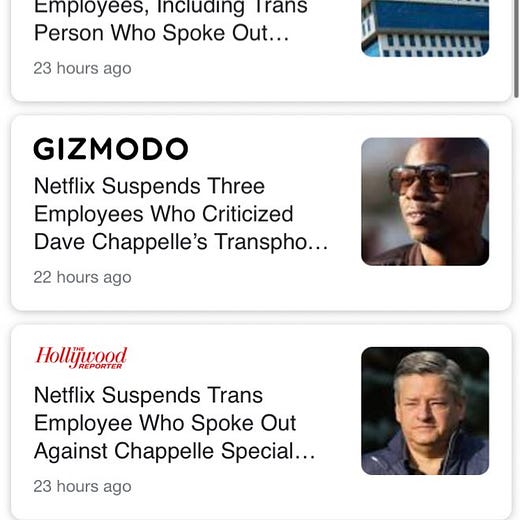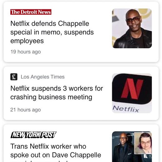 Netflix fires walkout leader for leaking data: https://www.theverge.com/2021/10/15/22728337/netflix-fires-organizer-trans-employee-walkout-dave-chappelle